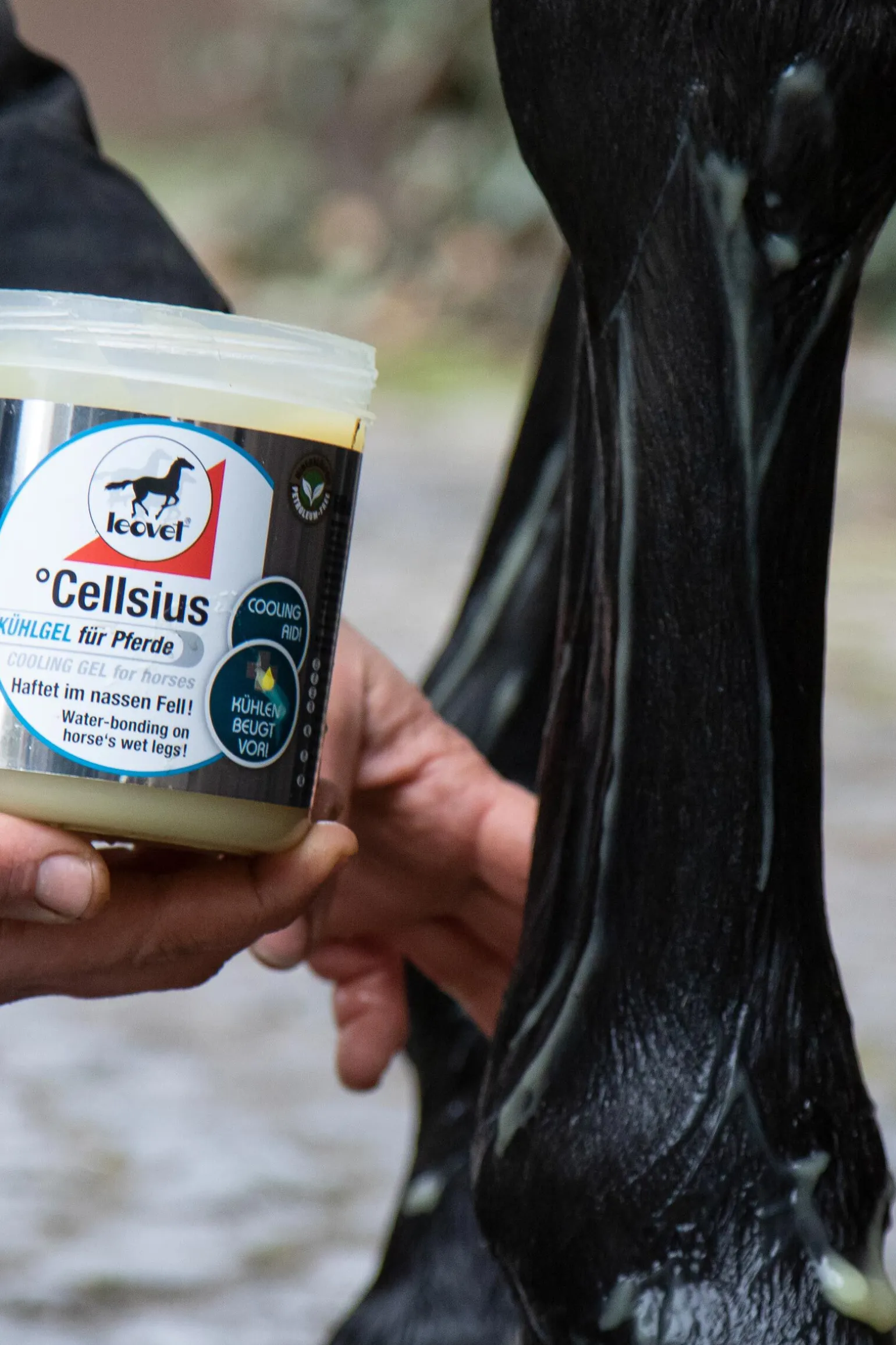 Fester seg på hestens våte bein med den nye WATERDROP teknologien.Holder på kjøleeffekten du får av en rask spyling av hestens ben.Kan påføres hestens våte ben og holder seg på plass akkurat som kjøleleire.Den sterke, langvarige kjøleeffekten penetrerer dypt og stimulerer hurtig restitusjon, samt lindrer anstrengte ligamenter, sener og muskler.Inneholder trollhassel, frankincense harpiks, arnica og rosmarin.Har en sammentrekkende, vitaliserende og lindrende effekt.
