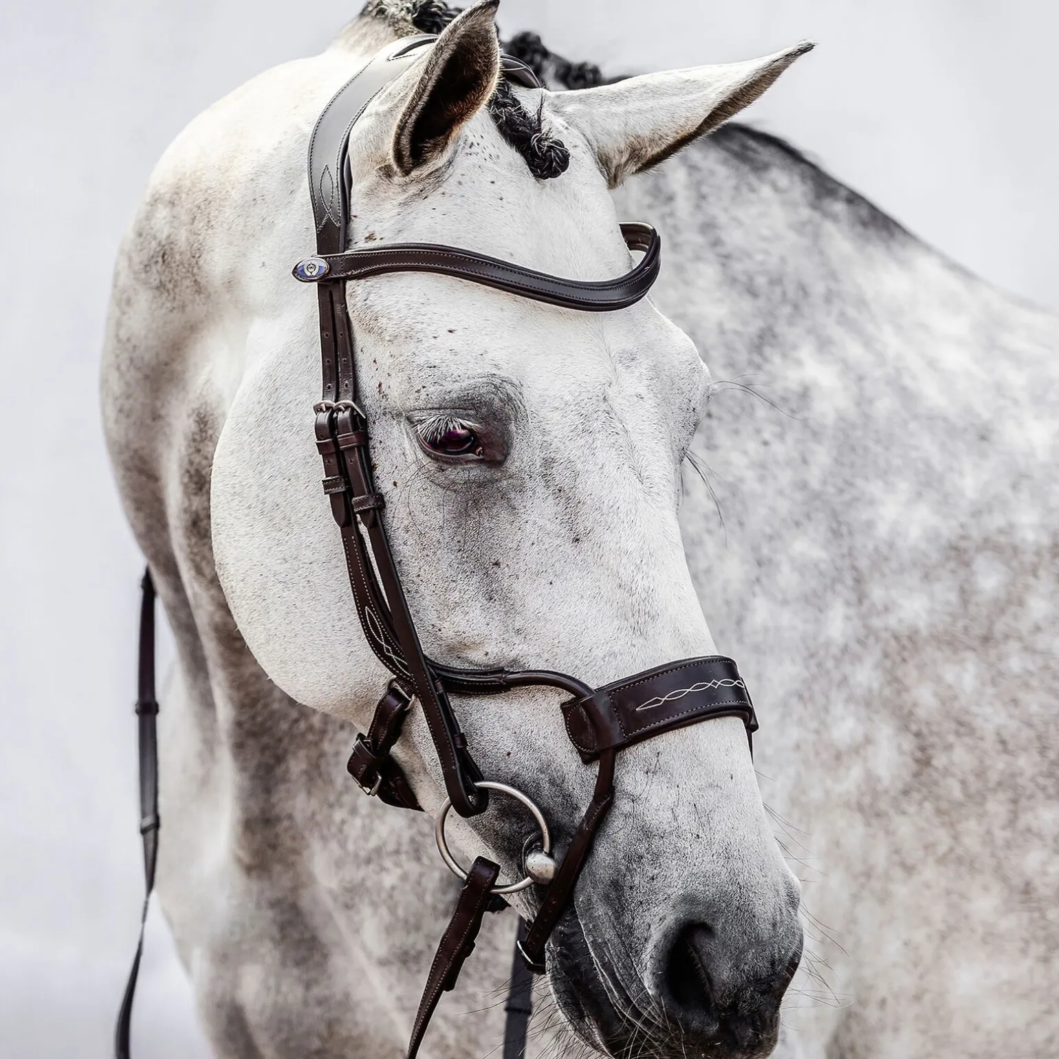 Nesereima kommer med et helt nytt design.Det legger ikke noe press på tennene fra utsiden, noe som reduserer muligheten for bittrelaterte skader.Pannebåndet har det unike patentsøkte Click-it™ør at du kan skifte pannebånd på noen få sekunder, selv om hesten har på seg hodelaget.Click It™å, med PS-logoen på seg.Buen som ligger over nesen er fleksibel slik at du alltid kan få en perfekt tilpasning for enhver hest.Nesereimen har dekorative sømmer og et mykt polstret pullback-feste.Du kan endre nesereimen for å møte ulike behov.Nakkestykket til hodelaget har et helt nytt og vifteformet design, noe som gir best mulig trykkavlastning for den sensitive nakken.Kinnstykkene er flate med normale spenner, og de patentsøkte Cradles™ør at bittet henger i hestens munn.Dette hjelper videre med å lette trykket på nakken.De spesielle vuggene er avtakbare og konstruert så de lett kan klipses av og på.