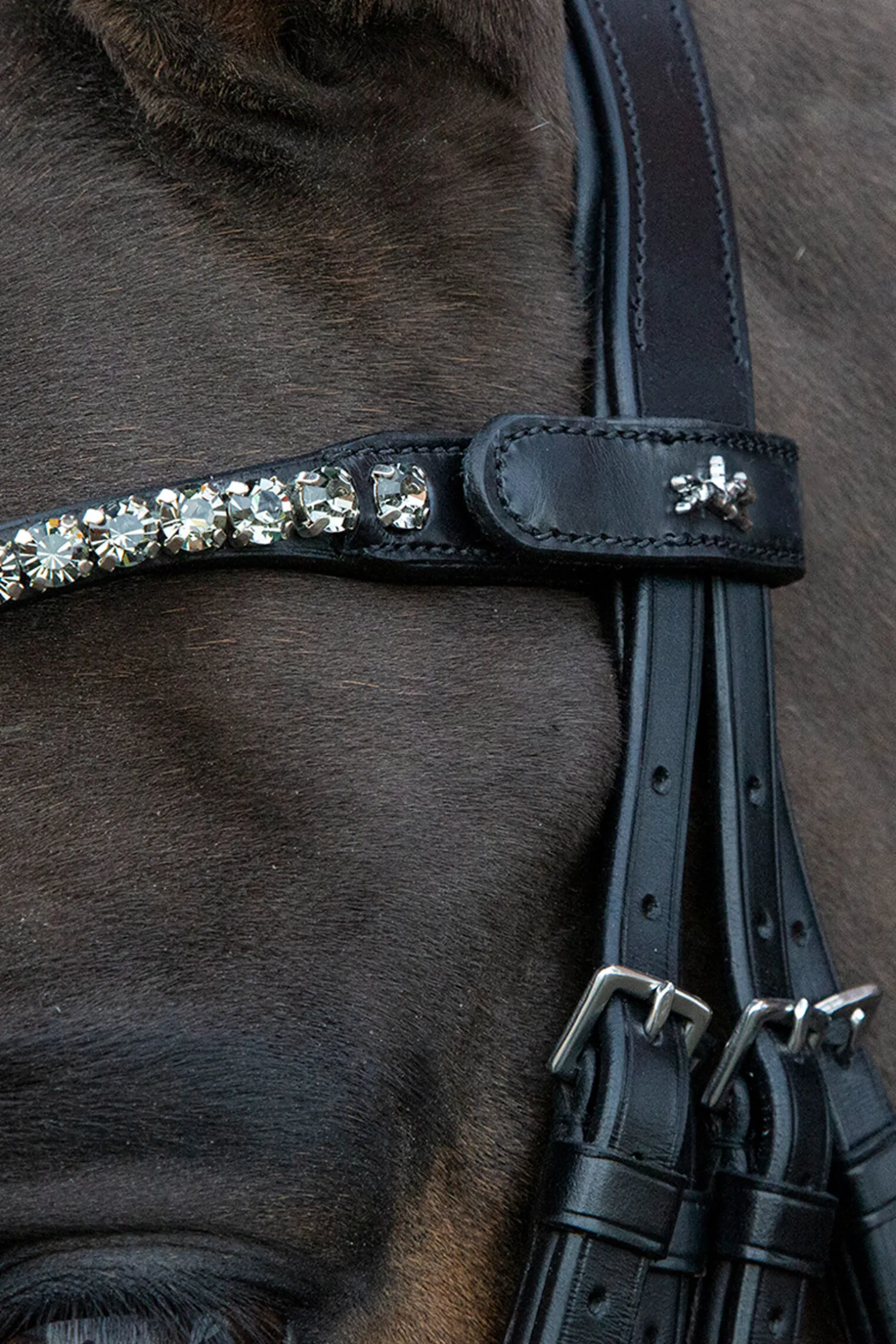 «Milazzo» premium dressur kandar etterlater ingenting å være ønsket. Med det anatomiske hodegjordet vil hesten din føle seg helt komfortabel både under trening og konkurranse. Kandar laget av høykvalitets, vegetabilsk garvet lær er visuelt imponerende med sin lakkerte nesereim og smale panneband med ekstra store krystaller.