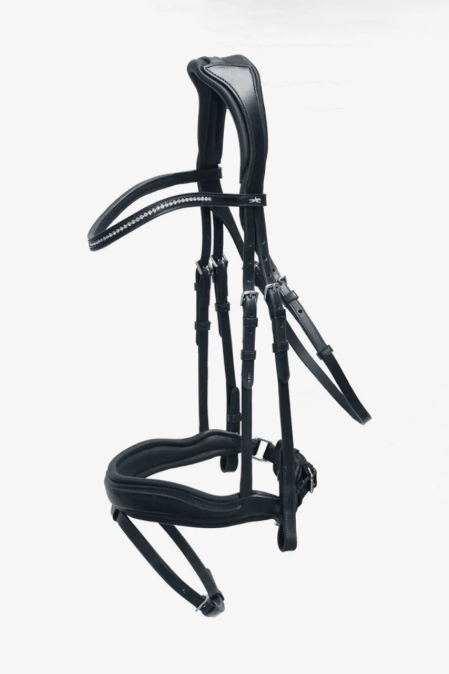 STANFORD kombinerer funksjonalitet og sportslig design: Hodelaget med anatomisk formet pullback-nesereim har et unikt nakkestykke. Dette er særlig formet etter hestens anatomi og gir ubegrenset bevegelsesfrihet til ørene. På grunn av reduksjon av trykk på sensitive områder rundt kinnbein og nakke er hestens komfort betydelig forbedret. STANDFORD kommer med to pannebånd: Ett enkelt pannebånd i lær og et med et smalt krystallkjede.FS-XL er kun tilgjengelig i svart/sølv.