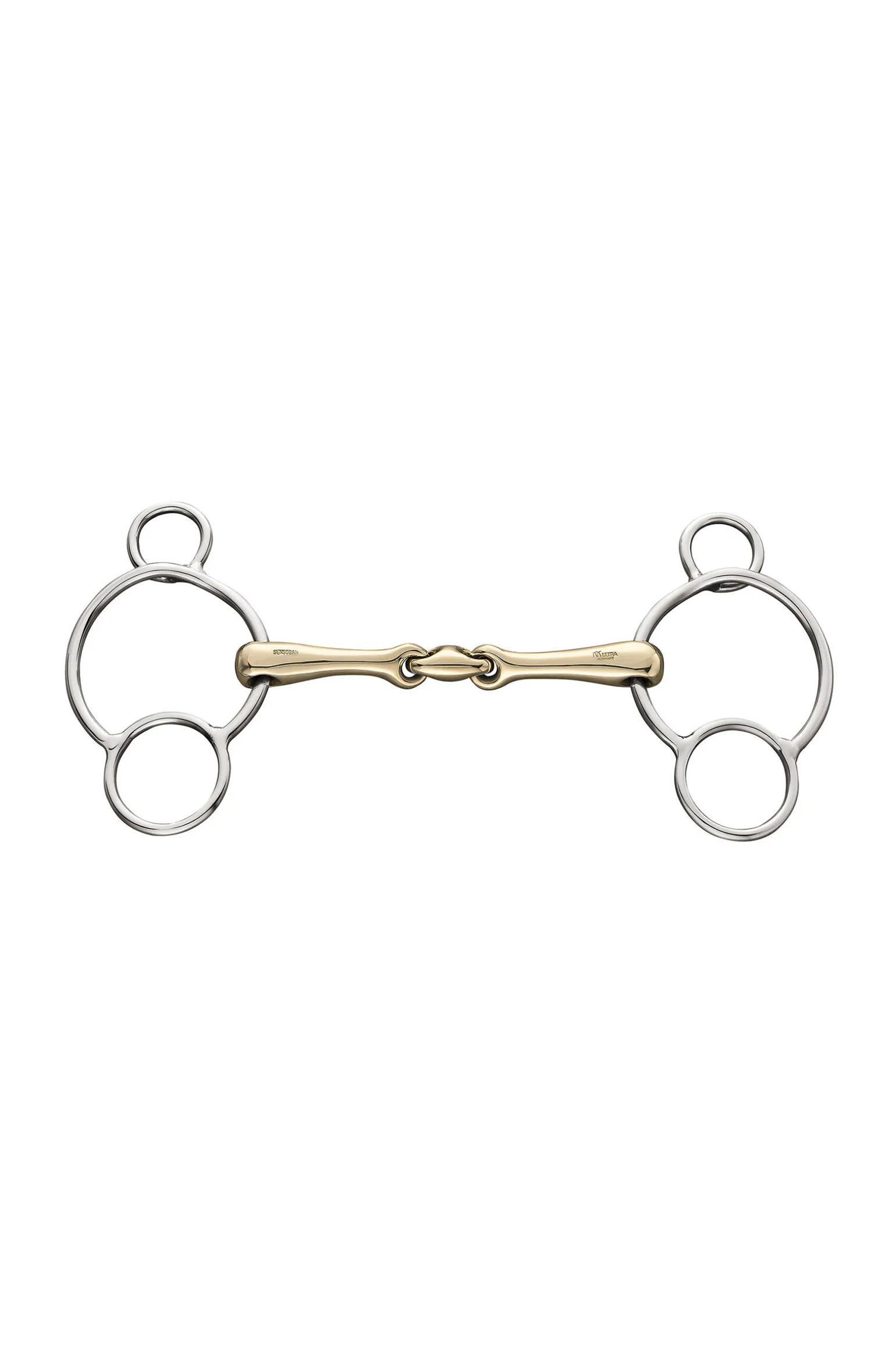 Munnstykke: Tredelt.Materialer: Sensogan med rustfritt stål på sidene.Tykkelse på bittet: 16 mm.Diameter på ringene: 70 mm.Ringtype: Universal.