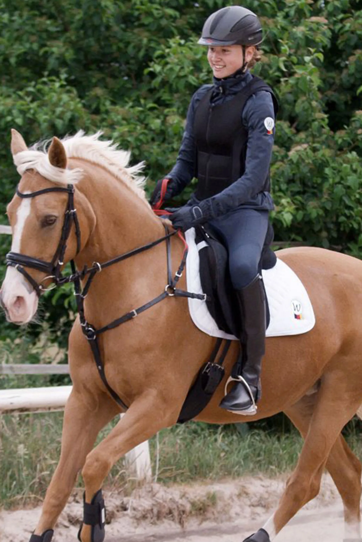 Det nye brystplaten med sikkerhetsliner er allsidig i bruk. Den tjener nybegynneren på longelina for å øve tøylekontroll, og letter overgangen fra longering til fri ridning. Den gir ekstra sikkerhet til nybegynneren under fri ridning.I tillegg kan kombinasjonen brukes for unge eller vanskelig å kontrollere hester som er tilbøyelige til uventede bevegelser, for å hjelpe rytteren. Sikkerhetslinen gir støtte til rytteren ved behov og virker gjennom forbindelsen med brystplaten på hestens bryst, og bidrar dermed til å gjenvinne kontrollen over hesten.