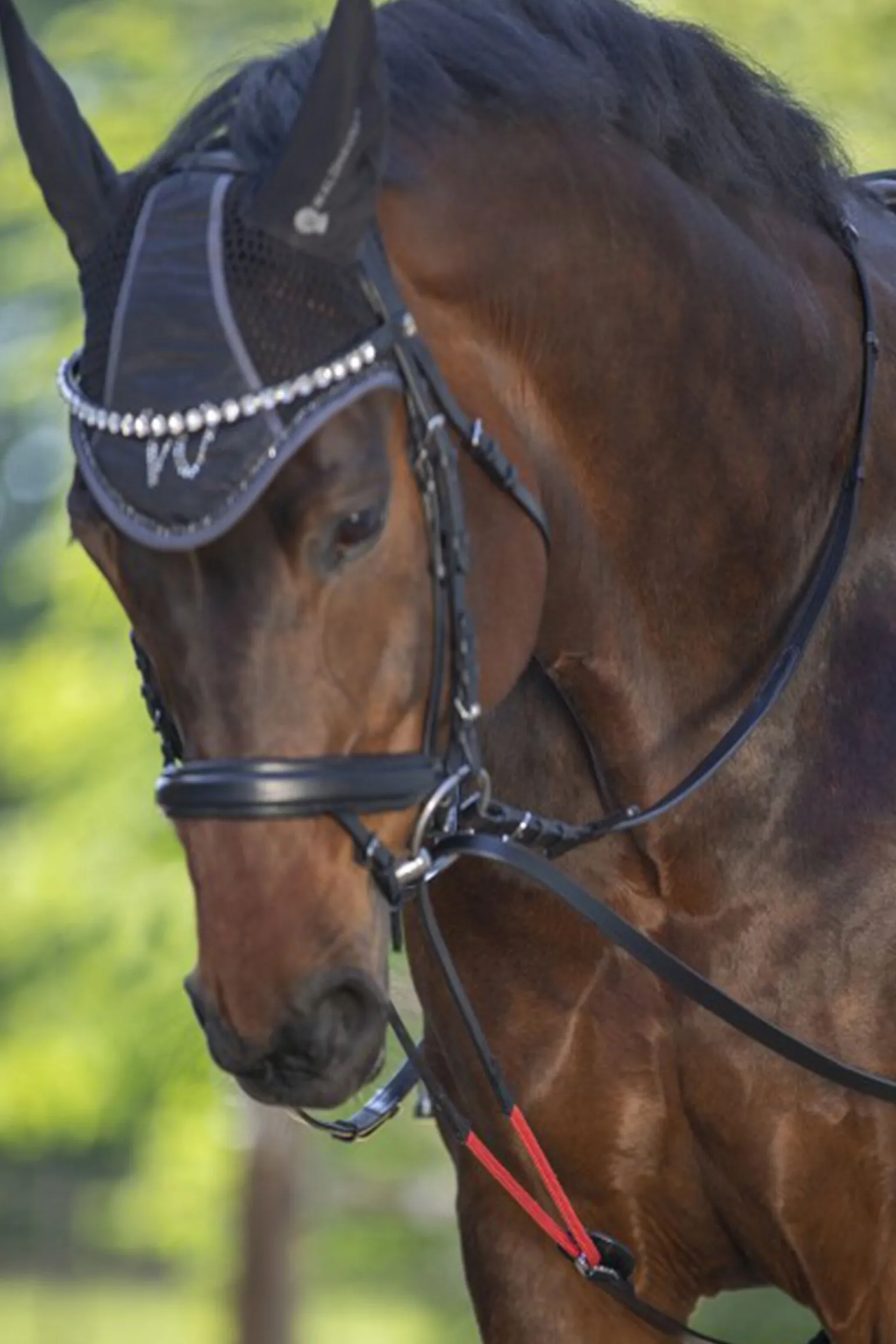 Innovative lengthadjustable and flexible leather draw reins for riding or lunging. The WtrainRein draw reins are attached to the girth or surcingle between the forelegs. A esecial rein runs through a guide roller and is taken from there through the reesective bit ring (from the inside to the outside) back to the girth or surcingle. The guide roller gives the reins and facilitates a gentle and mouthfriendly bending and suppling whilst riding or lunging.